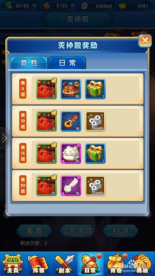 灭神殿奖励分为首胜奖励以及日常奖励,首胜奖励只有第一次通关升级之后可以领取,日常奖励则每日可以领取,都需要达到指定的层数才能够领取。