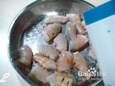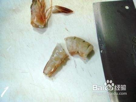 1把虾去净虾肠剁掉头尾不要,把虾身切为两段。