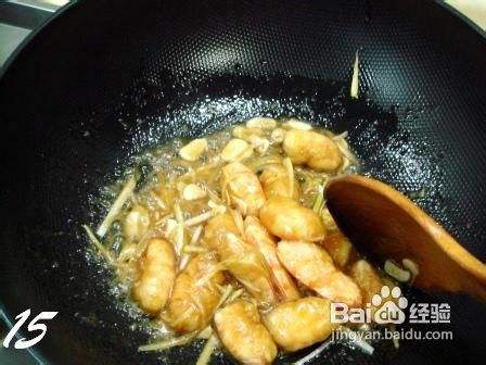15碗芡下锅摇动炒勺,用旺火翻炒两三下便可出锅。