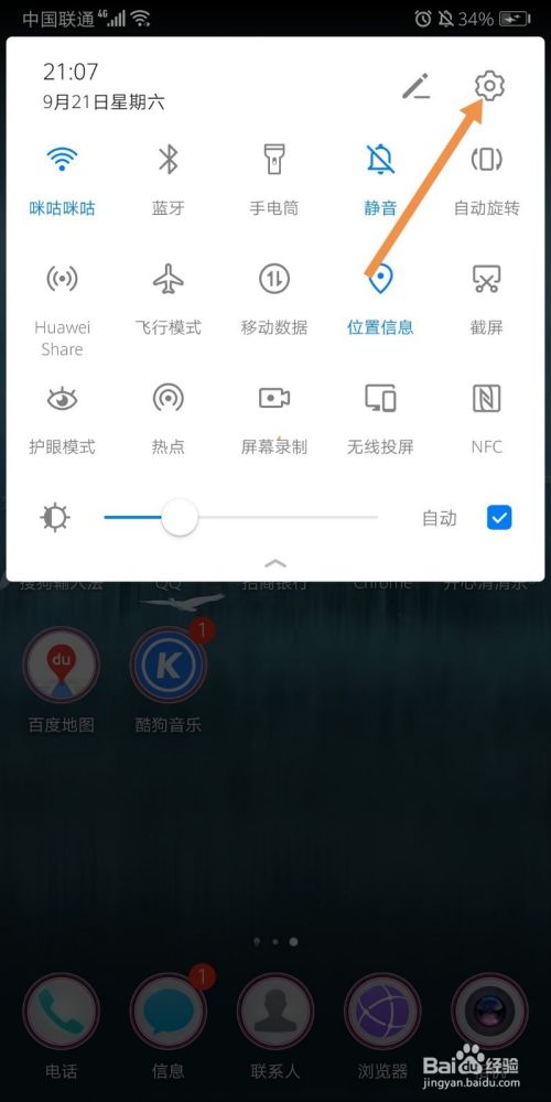首先从上往下滑动屏幕,下拉菜单找出来点击里面的齿轮图标。