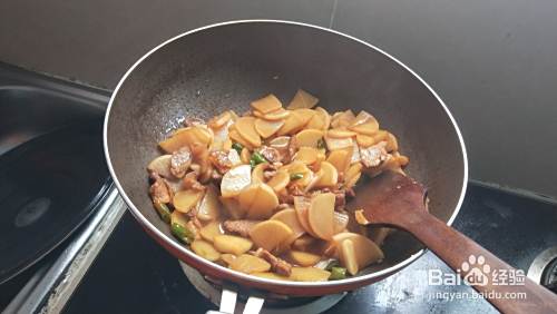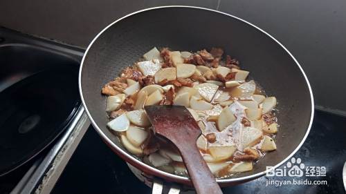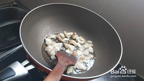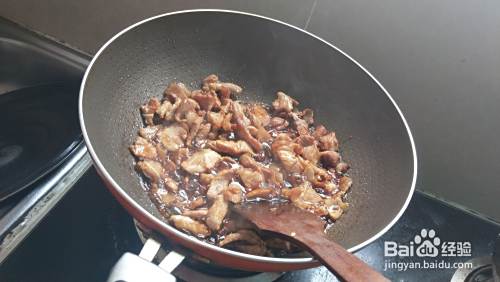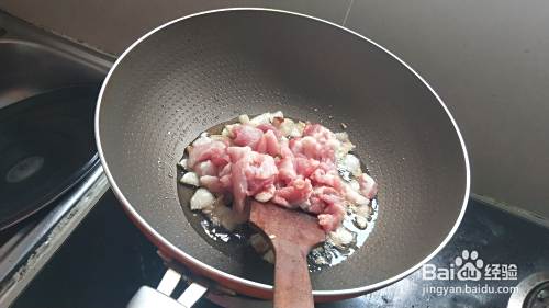 如图,当猪油煸出后放入瘦肉继续煸炒。