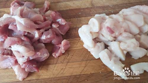 如图,首先取来一块新鲜的猪肉,洗净后将肥肉、瘦肉分开切好。