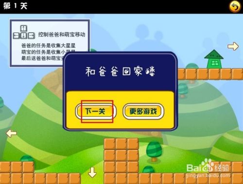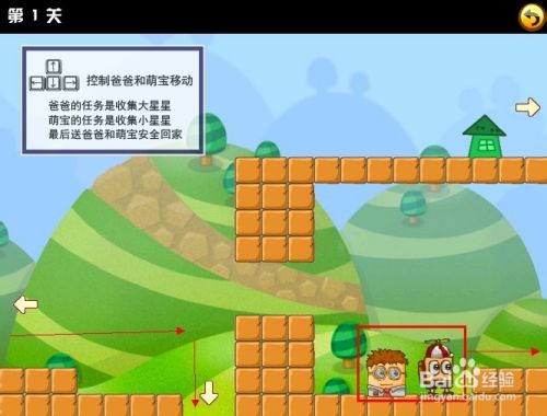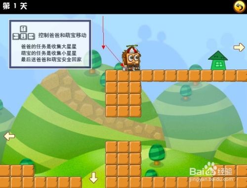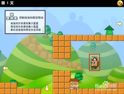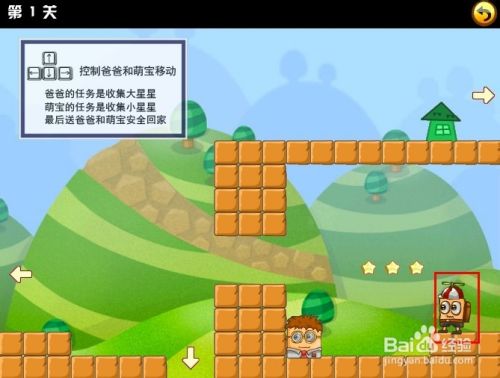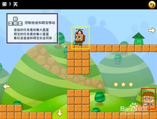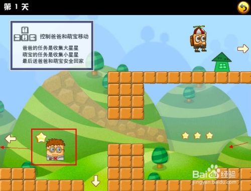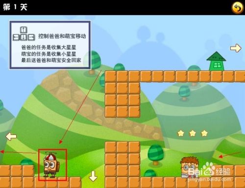 刚挑战的第一关时,游戏界面的左上角会有文字操作提示,只要使用键盘方向键控制这对父子前进收集所有的星星再找到房子回家就行了。注意的是,萌宝跟爸爸是在两个不同的地方的哦。
