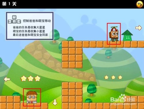 根据提示,爸爸只能收集大的星星,萌宝只能收集小的星星。首先使用键盘方向键控制爸爸跳跃收集大星星。并顺着箭头走到右边的地方。需要注意的是,由于两个角色是同时使用键盘方向键来控制方向的,所以是一起移动的。