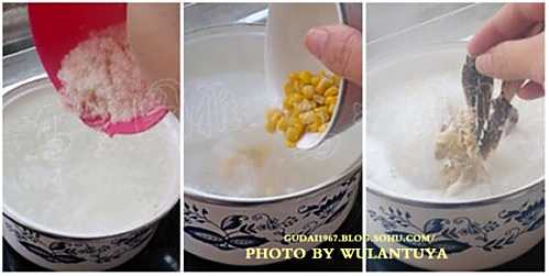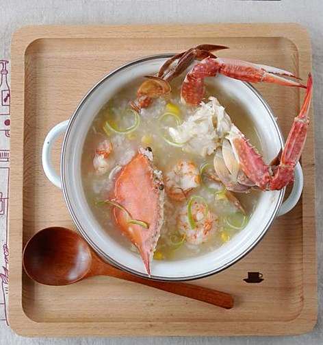 原料:大米200克,蟹2只,大虾仁10只,熟玉米粒适量,盐,姜丝适量