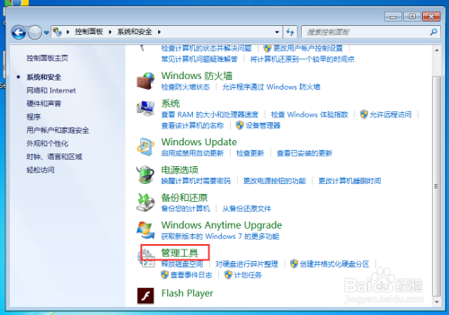在系统和安全界面,找到并点击“管理工具”,进入管理工具界面。