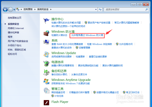 点击“开始”—“控制面板”—“系统和安全”,在系统和安全界面,点击“允许程序通过 windows 防火墙”。