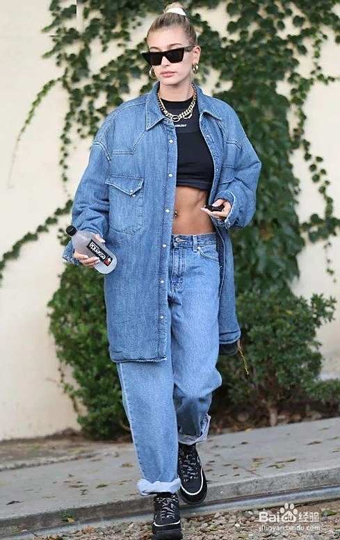 穿搭二:浅蓝色宽松牛仔大衬衫+黑色背心+浅蓝色牛仔老爹裤+黑色老爹鞋