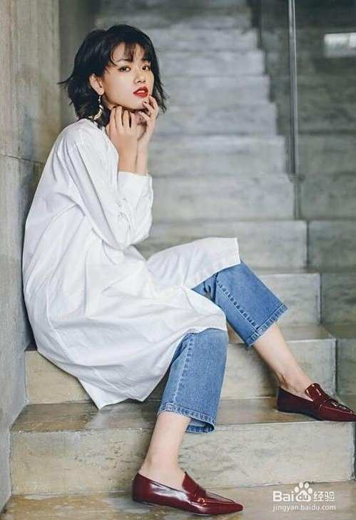 白色宽松大衬衫是很简约又个性的一款,每年都会流行白色宽松衬衫,搭配一条浅蓝色九分直筒牛仔裤和一双酒红色复古风皮鞋,随时休闲的穿搭,但是也很复古、精致。