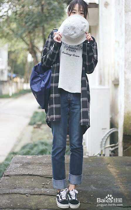 穿搭一:藏蓝色格子宽松大衬衫+浅灰色字母T恤+深蓝色卷边牛仔裤+黑色帆布鞋