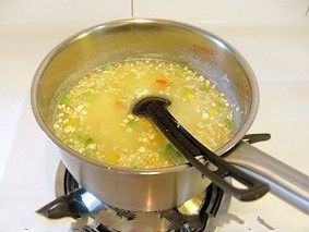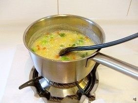 7.粥煮到米粒开花就可以了,这时放入蔬菜丁和燕麦片,不易煮熟的蔬菜可以先放,略煮一下至所有材料成熟就可以关火了。
