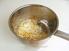 3.取小锅,放入淘洗干净的大米和浸泡过一晚的棒渣,再注入足够量的清水。