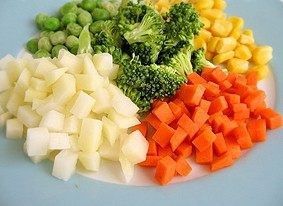 6.在粥快煮好的时候准备蔬菜,把你选的蔬菜洗净,切小丁备用。