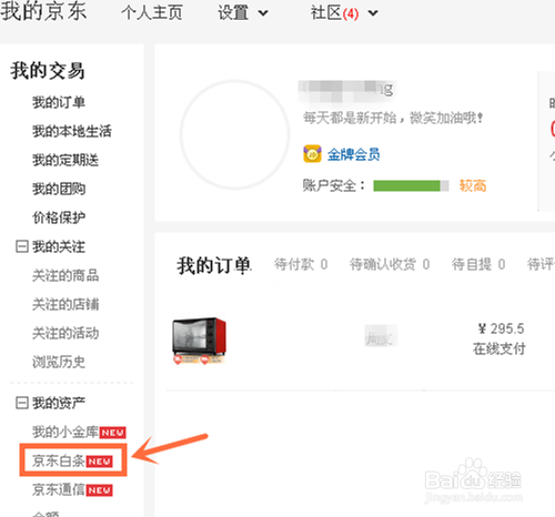 登陆京东网站,进入我的京东,在左边的导航条就看到很醒目的京东白条了,如下图