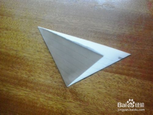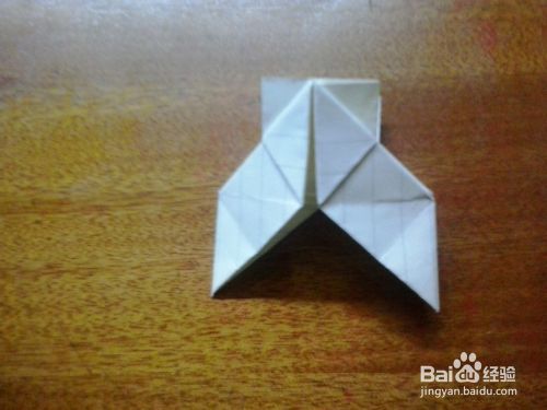 第四步:把提拉起来的折纸,对折,压扁,就变成了下图的形状,根据上面的步骤像这样折三个图形