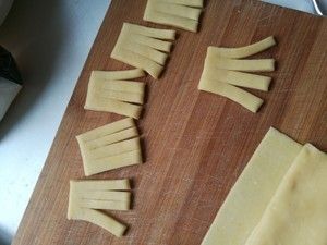 切成10公分宽度长条,对折切成如照片形状,中间三到刀不断来开。