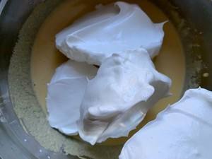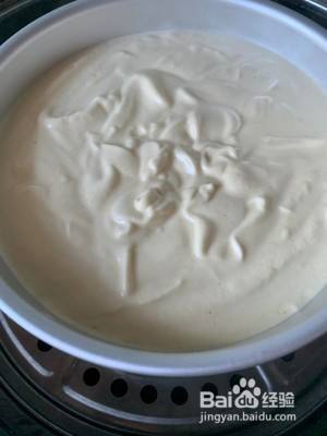 然后倒入剩下的蛋白盆里,翻拌均匀,倒入八寸蛋糕模具里,震两下放入已经烧开的蒸锅