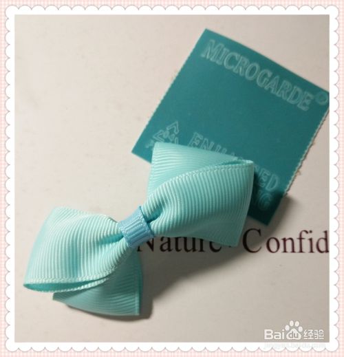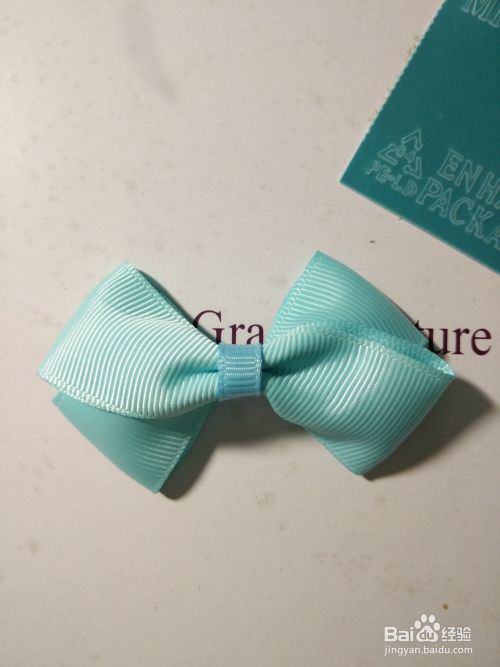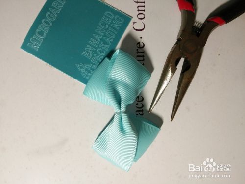 4、裁一节0.5CM*4CM同色缎带,用热熔胶枪固定到蝴蝶结绑扎丝位置处,这样一个漂亮的兰色蝴蝶结就制作完成了。