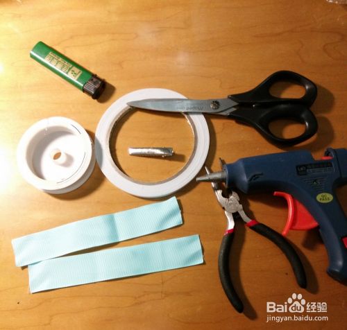 兰色罗纹缎带、双面胶、专用扎丝、剪刀、热熔胶枪、尖嘴钳、打火机、鱼嘴夹。