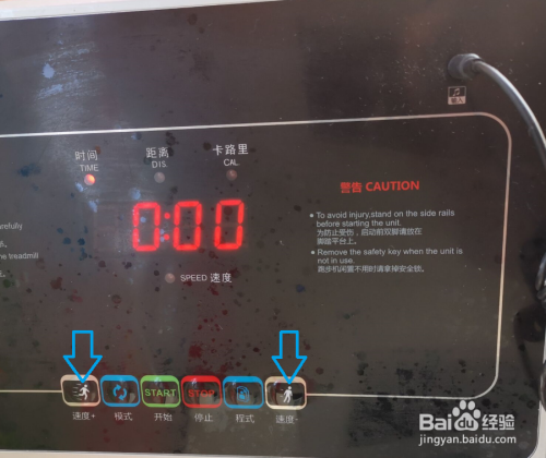 跑步机初始速度很慢,若想调节速度则点击速度+或者速度-按钮来进行调节。