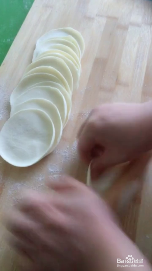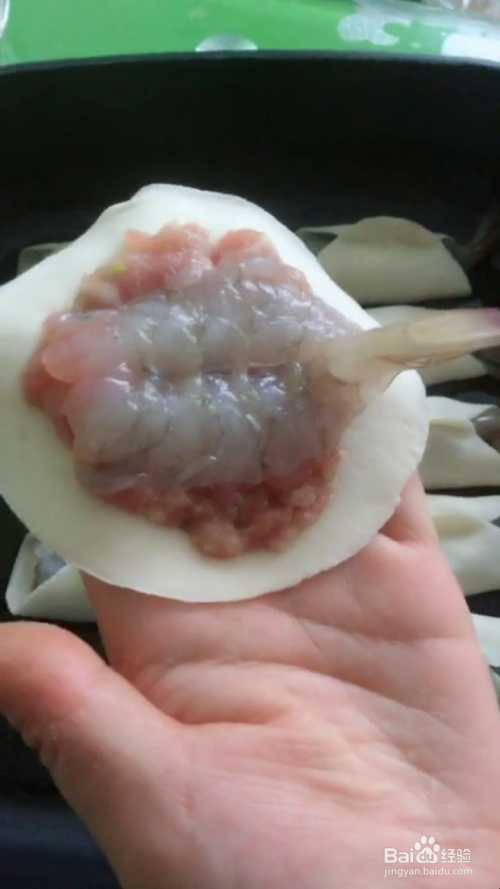 将揉好的面团分成小剂子,擀成饺子皮,将肉馅和虾仁放上,包起来