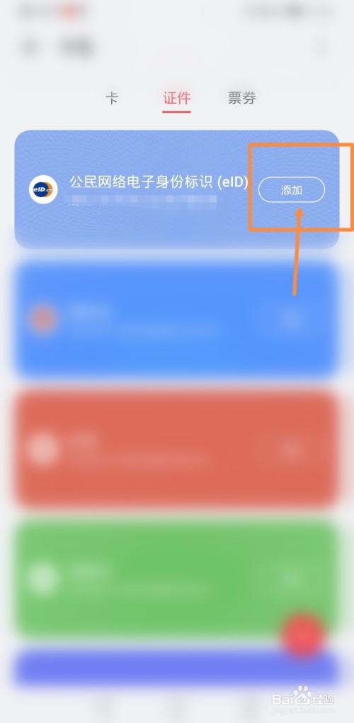 切换至证件页面,点击公民网络电子身份标识中的添加,如下图所示: