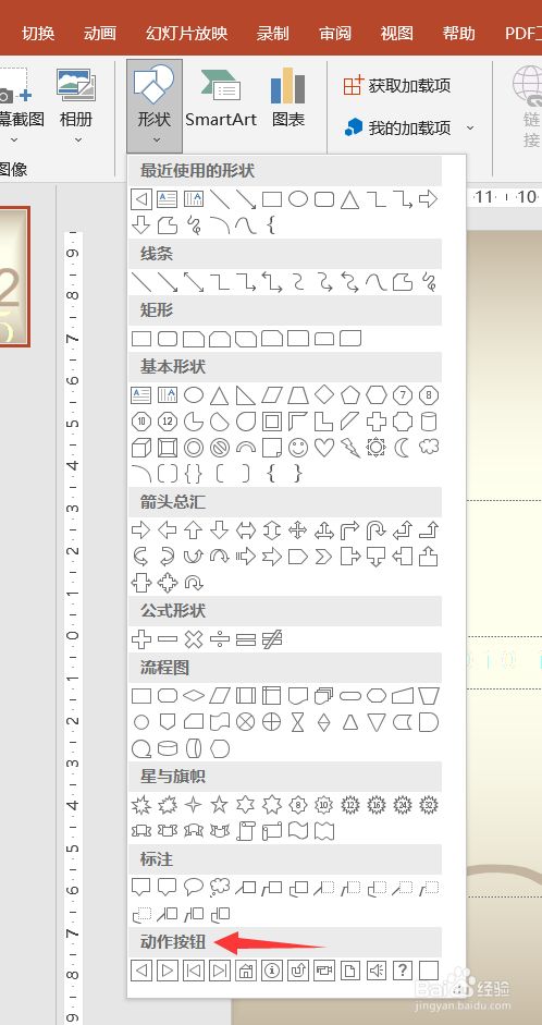 进入ppt后点击插入,选择形状后点击动作按钮,然后选择合适的按钮并设置相应的要求,解决ppt按钮怎么设置在哪里的问题。