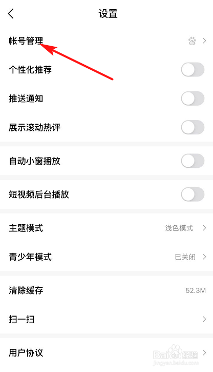 3、进入设置页面后,点击-账号管理