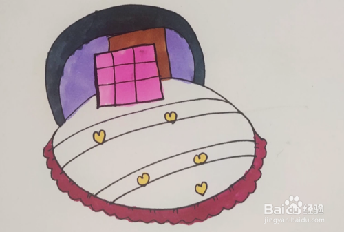 然后我们开始画细节,抱枕的花纹,床单的花纹等等,然后用马克笔填色。