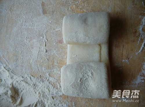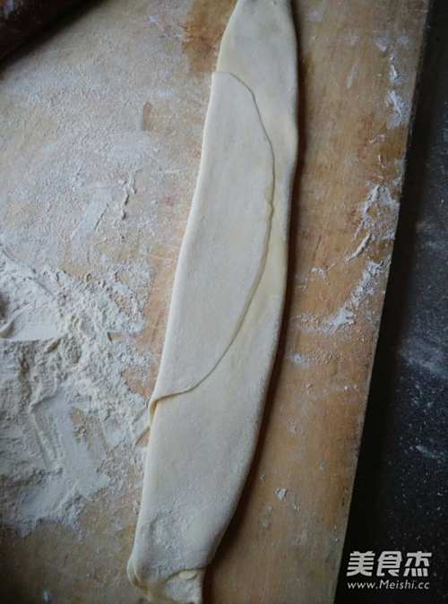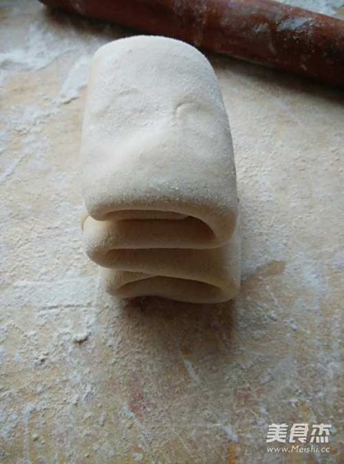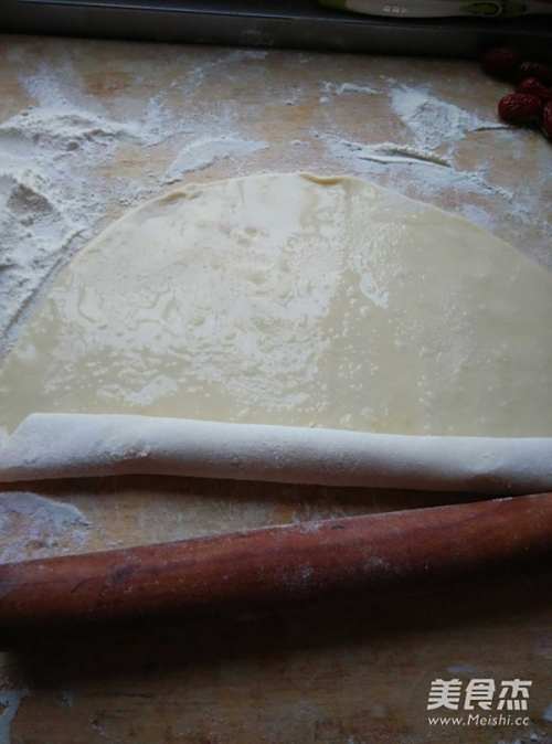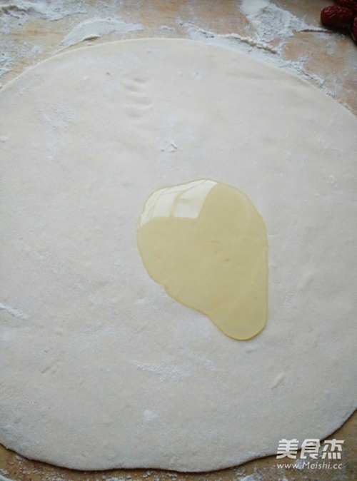 4然后取一块擀成大饼,放上一点油抹平,油不要放的太少一免不起层,也不能太多易流出
