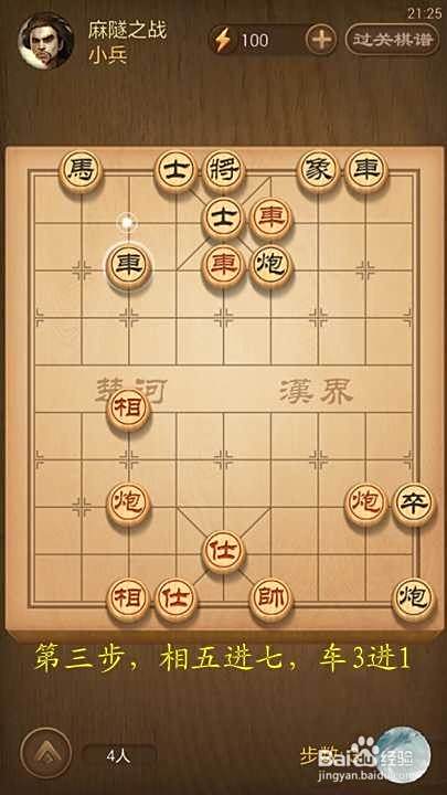 第三步,相五进七,车3进1;此步也是本局获胜的关键所在。其目的在于牵制对方的车以及可以架中炮,抽车将军等。如果对方车3进4吃相,红方可以炮七平五。然后车五进一吃士获胜。黑方3进1的目的实际上是一种诱惑[红方并车]