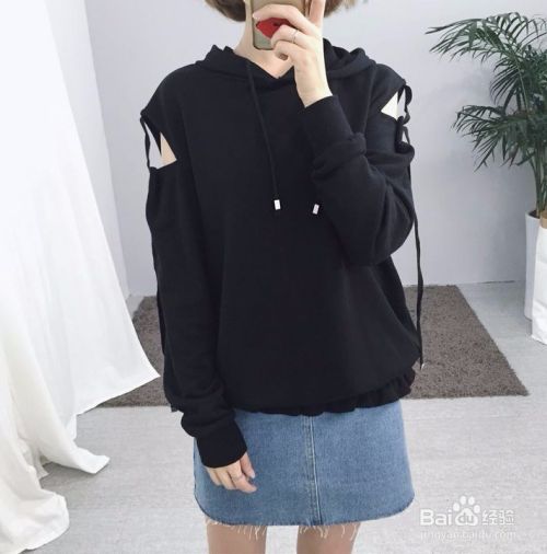 搭配七:黑色连帽卫衣+牛仔短裙