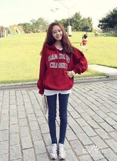 在卫衣的搭配中怎么能少了牛仔裤,这款蓝色小脚牛仔裤可以说是我们一年四季必备单品了,搭配一件酒红色连帽卫衣十分青春靓丽。