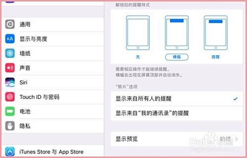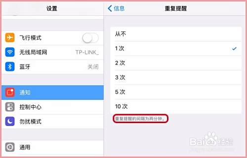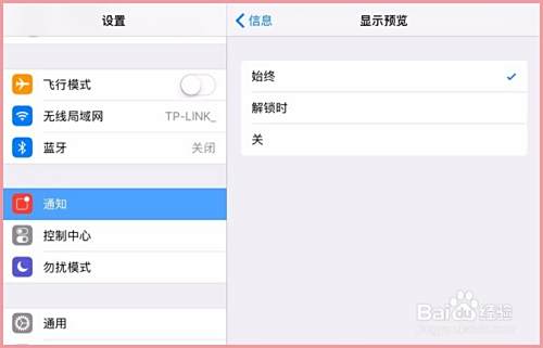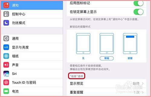 主要操作与上面的一致,但信息多了一项“显示预览”,默认是“始终”显示预览,如果不想被别人看出大致内容可以选择关闭预览效果;而重复提醒只需要一次就行。