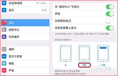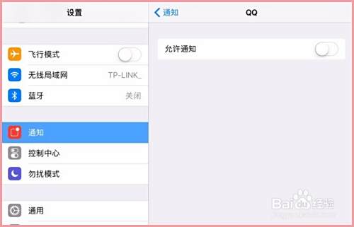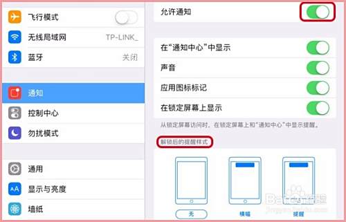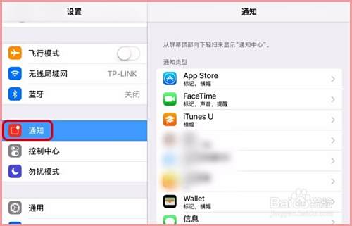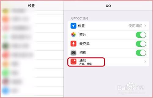 打开 iPad 桌面找到【设置】,左侧点开【通知】,在“通知类型”里会显示标记、横幅、声音和“关”四种主要类型,以QQ为例点开它再点【允许通知】后面的小按钮,绿色为开启白色为关闭。