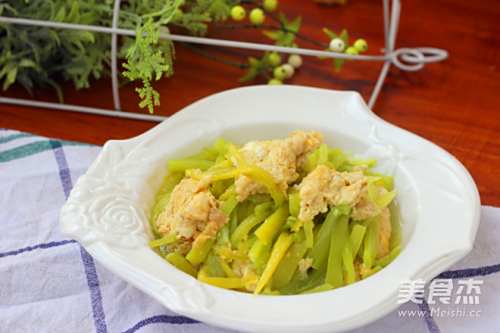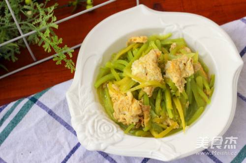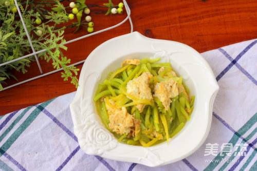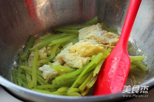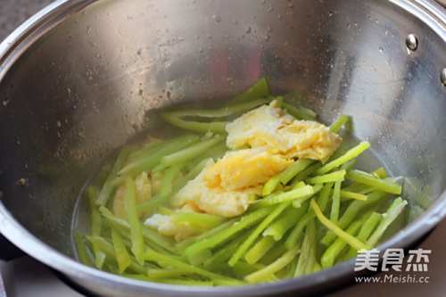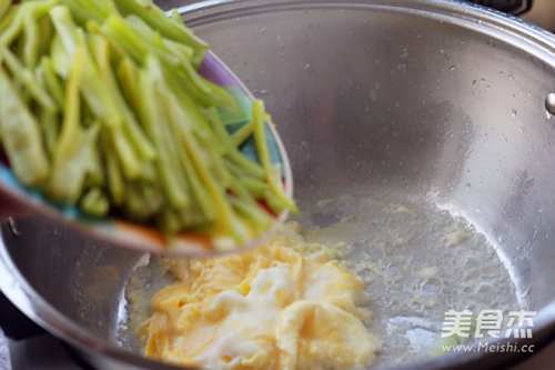 5鸡蛋凝固之后用铲子把鸡蛋扒到一旁,倒入青椒。