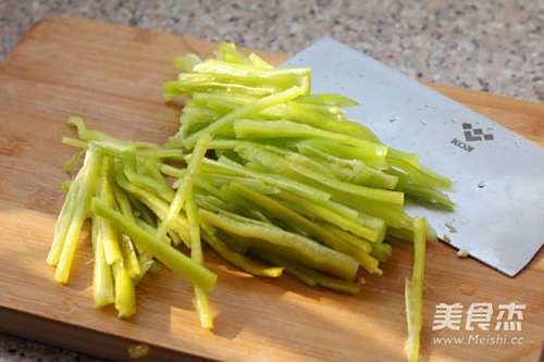 2青椒洗干净去蒂和籽,切成细丝。