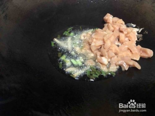 锅中入油,放入生姜,葱炒香后,放入鸡丁翻炒至变色