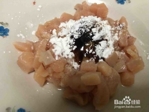 鸡脯肉切成丁放入耗油,料酒,生粉拌匀腌制10分钟