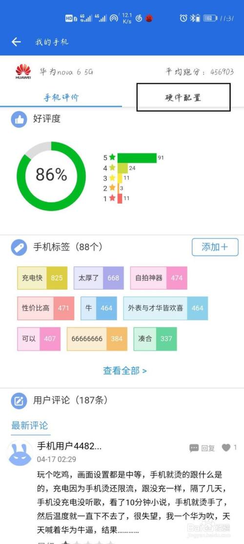 然后我们进入我的手机页面后,可以看到上方显示手机评价和硬件配置两栏,接着单击硬件配置打开。