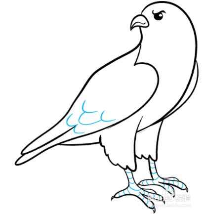画出猎鹰的小腿和脚,在每个脚趾的尖端绘制一个小的弯曲三角形,形成爪子。