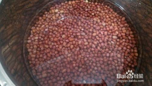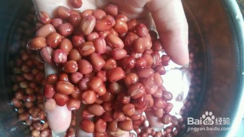 首先一斤红豆倒进个盆子里淘洗干净,再放适量水浸泡12小时,中途换两次水(此图已浸泡完成红豆发至差不多小黄豆大小)
