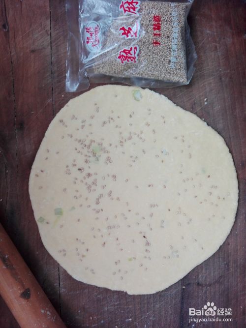 倘若厨房内有芝麻,在面层上撒些芝麻增添其香味也是挺不错的。用面棒在面层上将芝麻擀入面内。