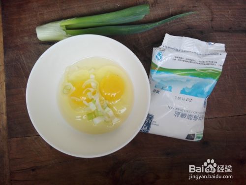 鸡蛋在碗中搅拌,搅拌过程中加入少许食盐和葱段。食盐用量以个人的口味添加。