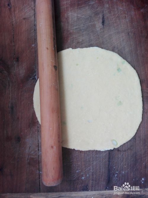 将和好的面团放在面案上用面棒辗成薄皮,厚度约0.5厘米的圆形状。