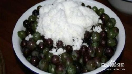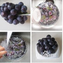 挑选洗净干净完好的葡萄(最好是有把的,水流不进,不易坏),舍弃软的坏的葡萄,浸泡十分钟面粉后备用