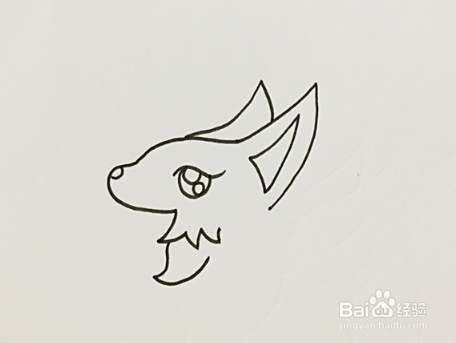 首先画出九尾狐的头部,画出头顶上的尖耳朵后,将侧面的一只眼睛和鼻子也画出来。