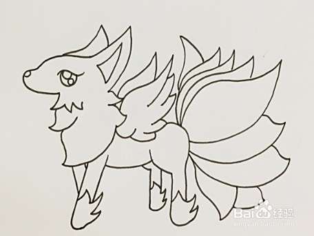 在尾部画出九尾狐的九条尾巴之后,在背部画出它的翅膀。