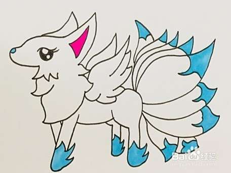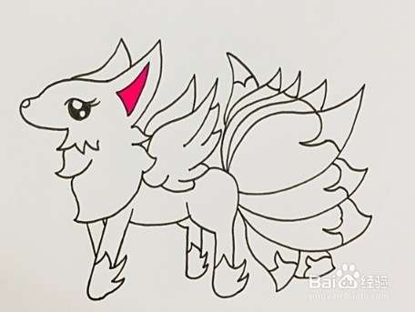 先画九尾狐头部与耳朵轮廓,画出眼睛与鼻子,然后往下画出身体躯干,还要将身后的九条尾巴和背部的翅膀画出来,再画出足部与尾巴末端上的纹理,将眼睛涂黑色、耳内侧涂红色,鼻头、足部以及尾巴末端涂蓝色,简单的九尾狐就画好了。