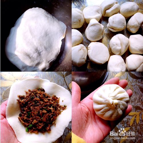 将面粉和盐放入容器中,倒入热水中搅拌揉成光滑的面团。分成14部分。擀出一份面团,加入大约25-30克的馅料。像面包一样裹紧。